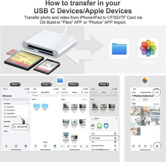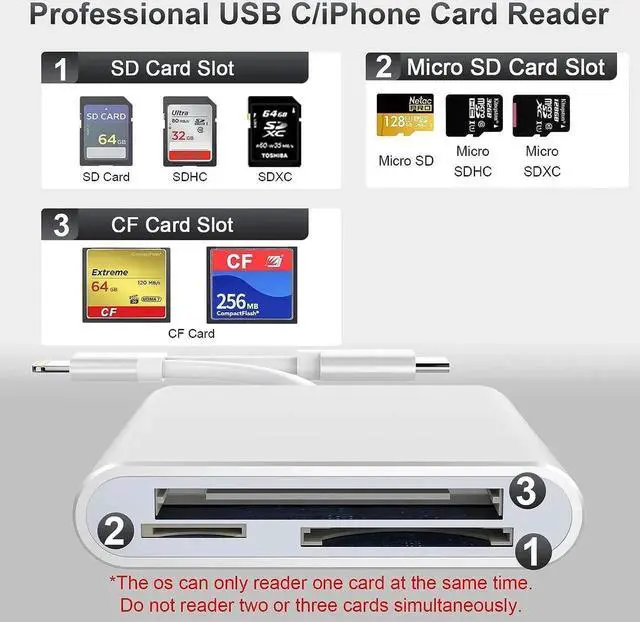 iPhone/USB C SD Card ReaderWith i-Phone and USB C ports, The memory card reader support all iPhone with iOS 12.0 and up and iPads with iOS 12.0 or later/OTG Android phone/Computer and other devices with Type-C/ USB-c port, allowing you to easily transfer the files you need between different devices.