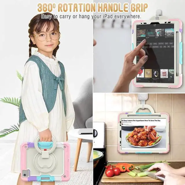 [PORTABLE/ADJUSTABLE SHOULDER STRAP] - With a portable and adjustable shoulder strap, allowing you to carry your iPad air 5/4 2022/2020 outdoors much more conveniently. You can carry it vertically or horizontally like a messenger bag, also can be hung on the car seat for watching video on the road, or even hang on wherever you want. Great for boys and girls taking to school and travel.