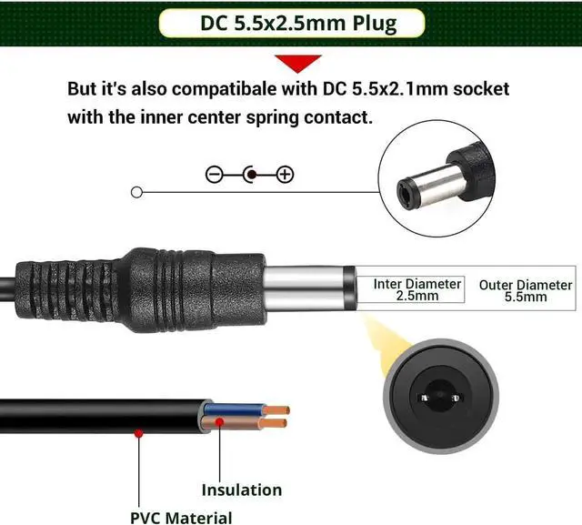 Plug Design-- Fit for both 5.5x2.5mm & 5.5x2.1mm plug. This cable terminates with a "standard" 5.5mm OD, 2.5mm ID DC plug, but it's also compatibale with DC 5.5x2.1mm socket with the inner center spring contact.