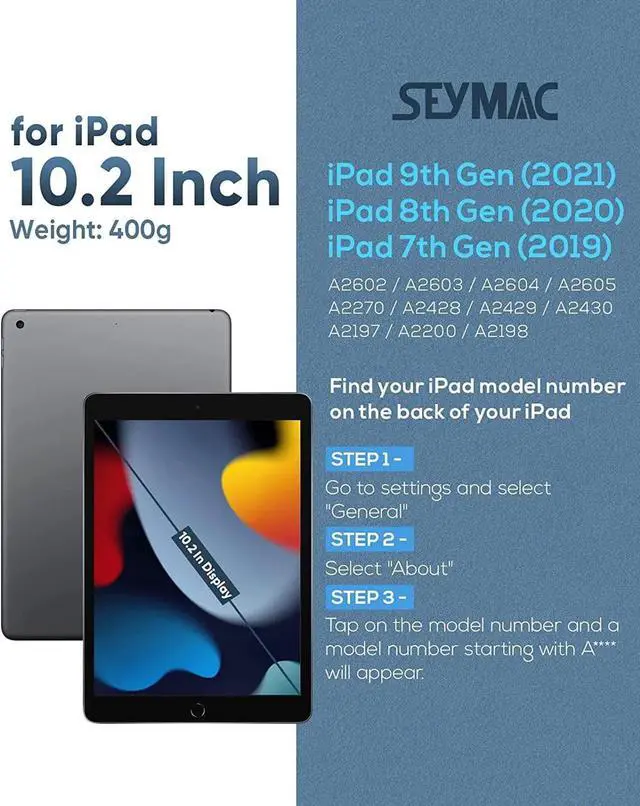 Compatible Model This iPad case is designed to fit 10.2 inch iPad 9th/ 8th/ 7th Generation 2021/ 2020/ 2019 release (Model: A2602 A2603 A2604 A2605 / A2197 A2198 A2200 / A2270 A2428 A2429 A2430). Please kindly check the model number on the back of your iPad (''Axxxx'') before purchase.