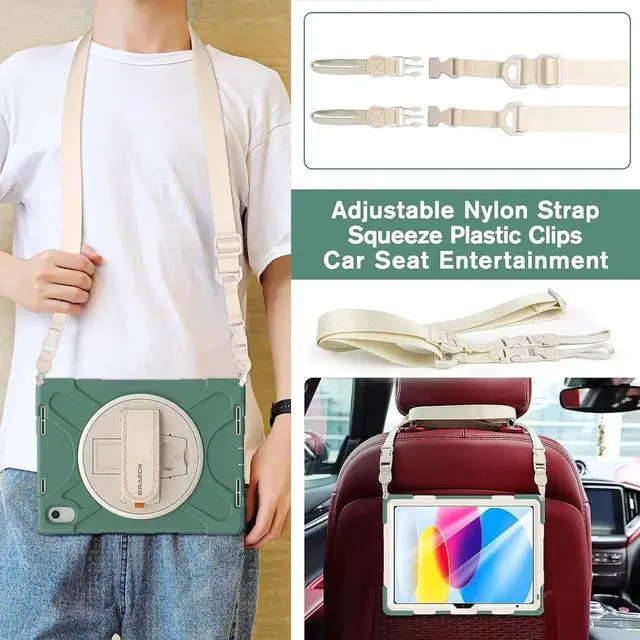 [Adjustable and Removable Carrying Strap] The portable shoulder strap allows you to safely carry your iPad in landscape/portrait mode outdoors, or hang your iPad in the kitchen, bedroom, or car seat for kids to watch videos or use for entertainment.