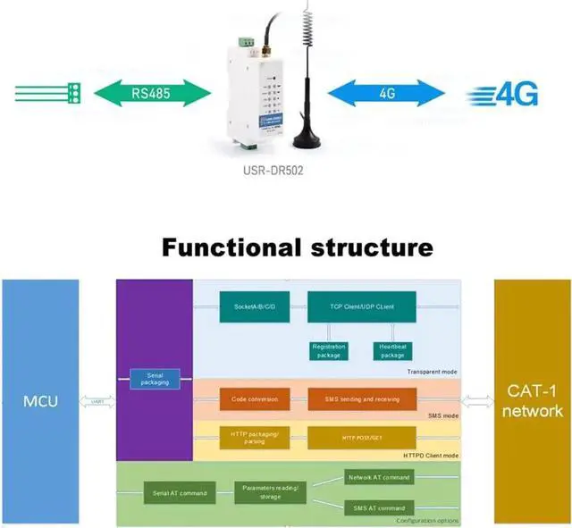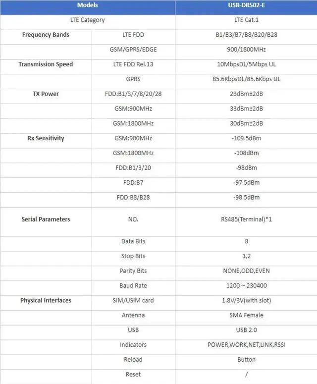 USR-DR502-E Wide Range Cost-Effective 4G LTE Cat 1 Modem Support RS485 Serial Port Sim Card Slot Built-in 35 mm DIN Rail Seat with MQTT/SSL (No Power Adapter,MQTT SSL Version)