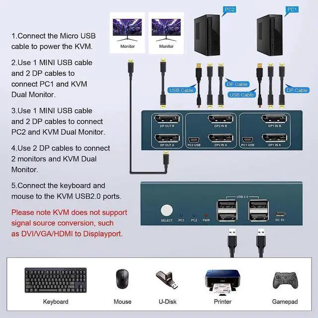 DP KVM Switch Dual Monitor The KVM Switch Displayport requires only 1 set of keyboard and mouse to control 2 computers and 2 monitors, for extended/copy display. It requires every computer support 2 screen or above display functions. Noted please: If your computer/laptops supports this function, but just 1 DP interface output, that maybe not suit for that.