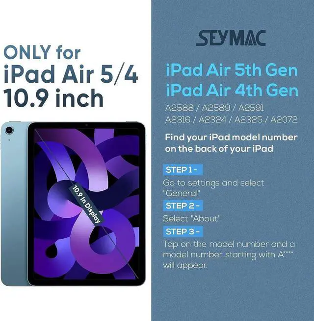COMPATIBILITY- ONLY Fits for 10.9 Inch iPad Air 5th Generation 2022 (Model: A2588 A2589 A2591), iPad Air 4th Generation 2020 (Model: A2072 A2316 A2324 A2325). Please double check the model number on the back of iPad (A****) before purchase.