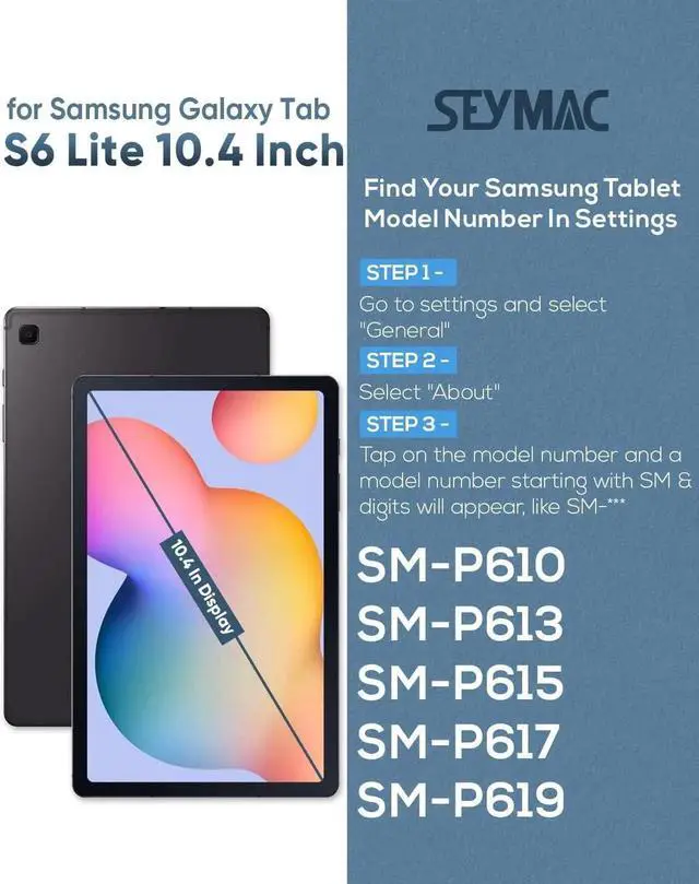 COMPATIBILITY- ONLY Fit 10.4 Inch Samsung Galaxy Tab S6 Lite 2020 release (Model: SM-P610/P615/P613/P619). NOT FIT 2019 Release Galaxy Tab S6 (SM-T860/T865). NO S PEN included. Please confirm the model (SM-P***) before purchase.