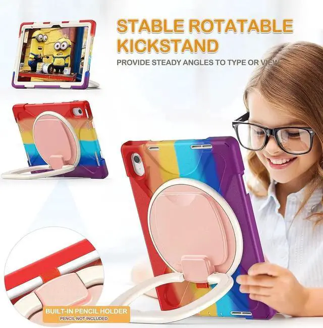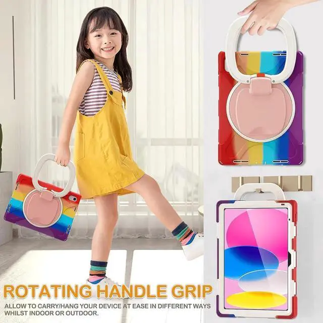 FUNCTIONALITY: 360°rotating +180°folding grip, can be used as a handle, easy to hang your iPad in kitchen, washroom, bedroom; Kickstand is stable enough to stand on different surfaces for children to view. Button and port cover enable to prevent dust.