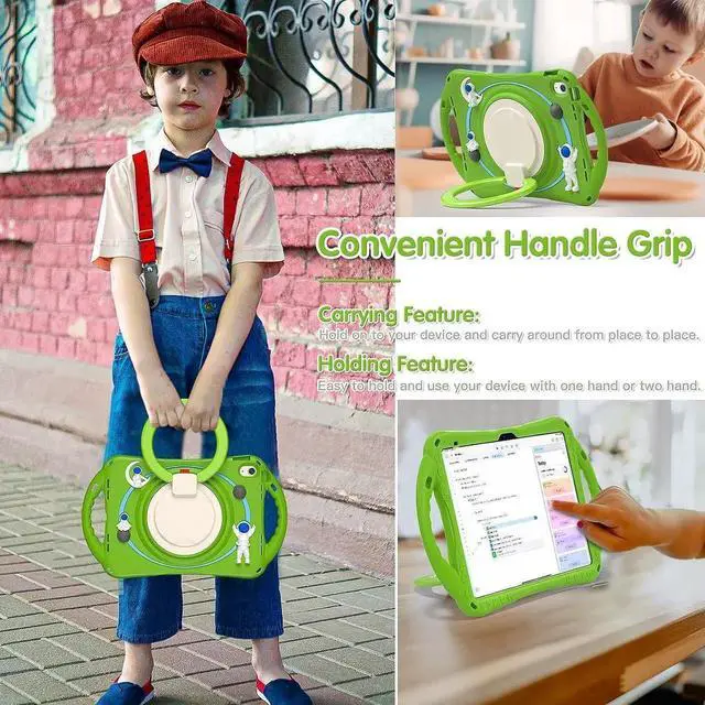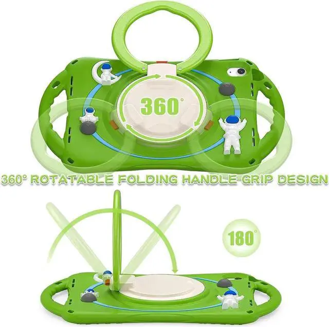MULTI-FUNCTION HANDLE-KICKSTAND- The 360 Degree rotating Kickstand provides multi-angle viewing, offering a pretty convenient use experience for film watching, working and typing. The stand is stable enough on several different surface. Open as a comfortable handle for gripping and carrying.The handles on both sides allow children to hold the iPad easily and safely.