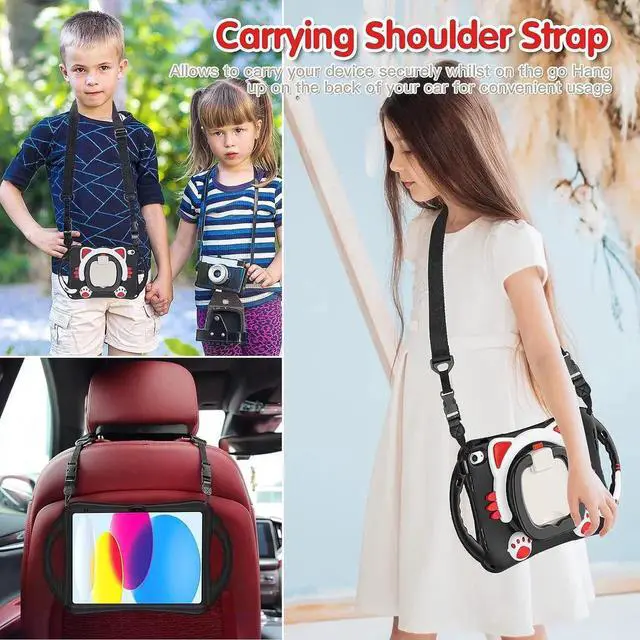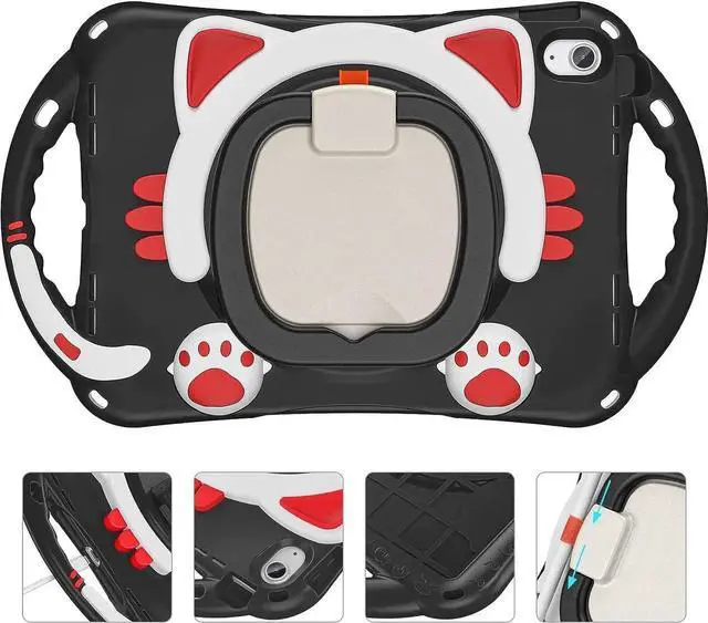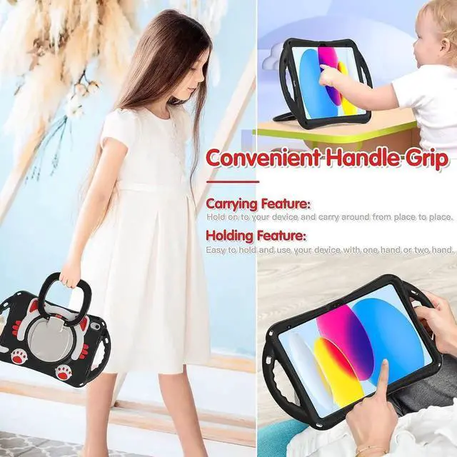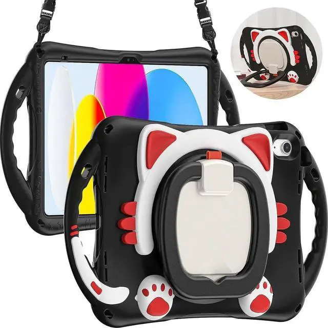 Cute Cat Case for iPad 10th Generation 10.9 Inch 2022, Silicone Kids Girls Case with Pencil Holder,Carrying Shoulder Strap,Handle Grip,Kickstand for iPad 10th Gen A2696 A2757 A2777-Black Red