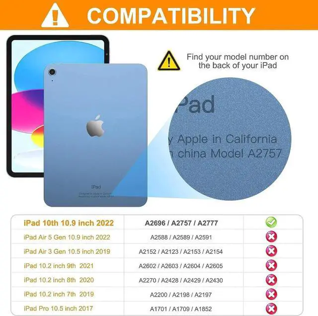 COMPATIBILITY- Specially design for New Apple iPad 10th generation 10.9 inch 2022 (Model: A2696 A2757 A2777). NOT COMPATIBLE WITH ANY OTHER DEVICES. (Especially incompatible with iPad Air 5th/4th Generation 10.9 inch). Please check your iPad on the back bottom to confirm the "AXXX" model number before purchasing. (Screen Protector and Apple Pencil NOT Included)