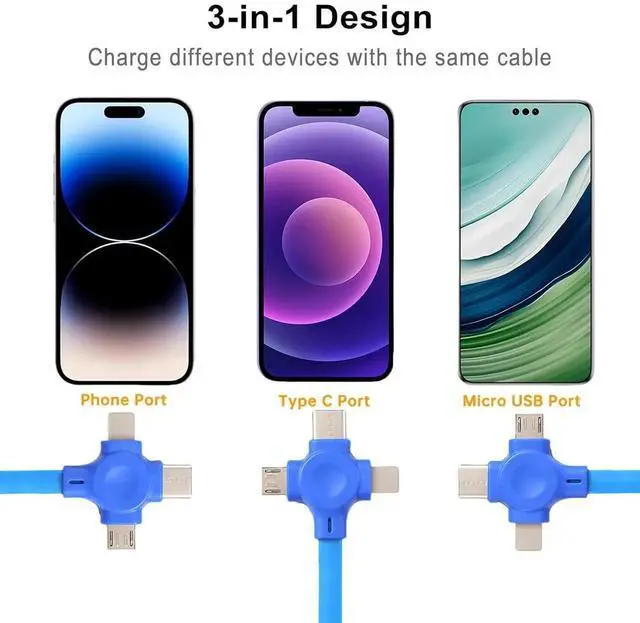 Charging Cable: The 3-in-1 retractable design which charges most of the cell phones and tablets available on market Compatible with iP USB-C and Micro USB.