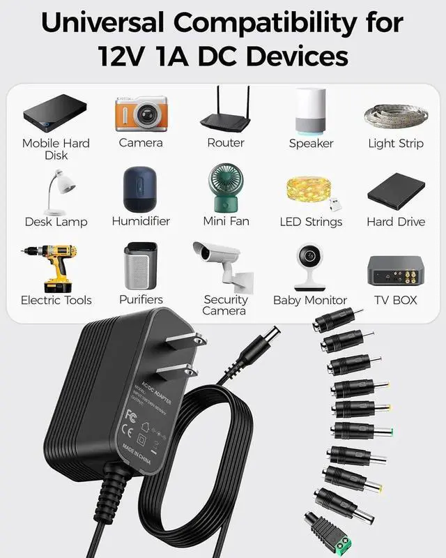Interchangeable Jacks: 10 Pieces different sizes replacement plug jacks which can be used for most of your dc in 12 v power cord devices. Regulated dc 12 v power replacement safe charging for your DC 12 V 1 A devices more choices and easty to carryReliability: CE FCC Listed charger for electronics regulated switching power supply has checked to work with 12 V max electronics equipment pass the overcurrent protection; overvoltage protection; short circuit protection and over temperature protectionWhat