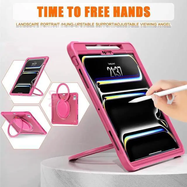 JAENFONG iPad Pro 13 inch Case 2024 M4 Chip Lightweight Dual-Layer Protective Tablet Cover, Durable Shock-Absorbing Corners with 360° Rotating Retractable Kickstand Ring Built-in Pen Slot, Pink
