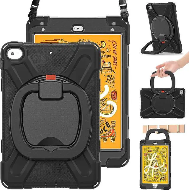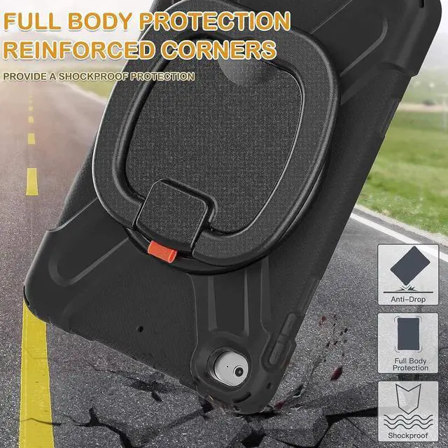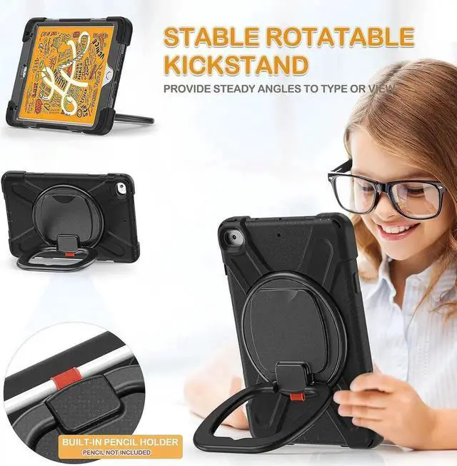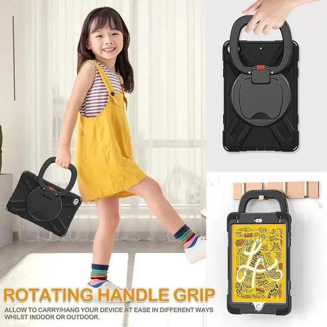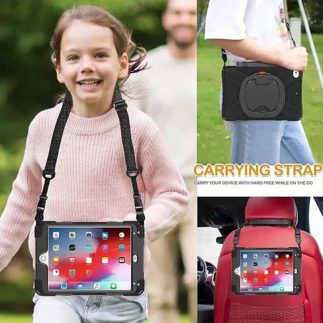 [MULTI-FUNCTION HANDLE] 360°rotating +180°folding Grip can be used as a handle, easy to hang your iPad in kitchen, washroom, bedroom; Kickstand is stable enough to stand on different surfaces for children to view. And with a adjustable shoulder strap, it is convenient for you to carry and hang everywhere. THE HANDLE IS UPDATED WITH SCREWS FIXED, MORE DURABLE.