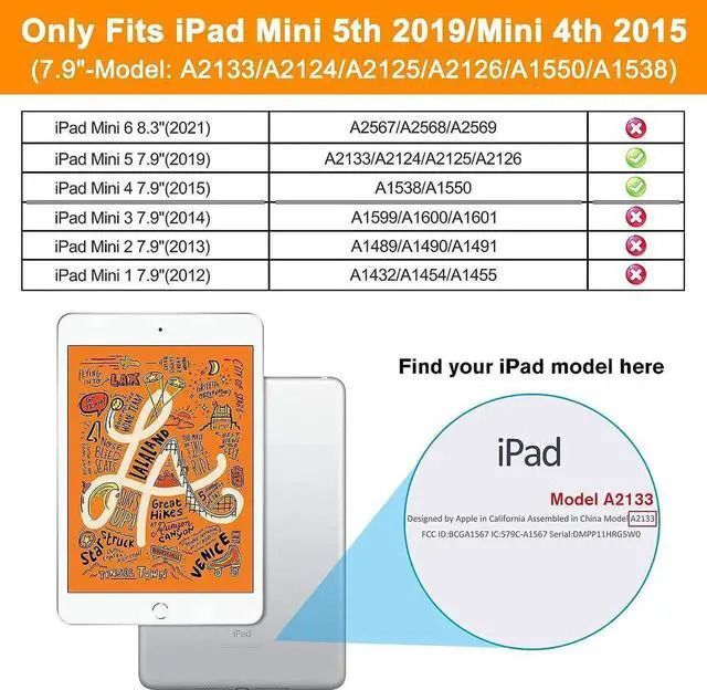 [COMPATIBILITY] Specifically designed for Apple iPad Mini 5th Generation 2019 release (Model:A2133/A2124/A2125/A2126), and Apple iPad Mini 4th Generation 2015 Release (Model:A1550/A1538 ), CAN NOT FIT ANY OTHER MODEL.