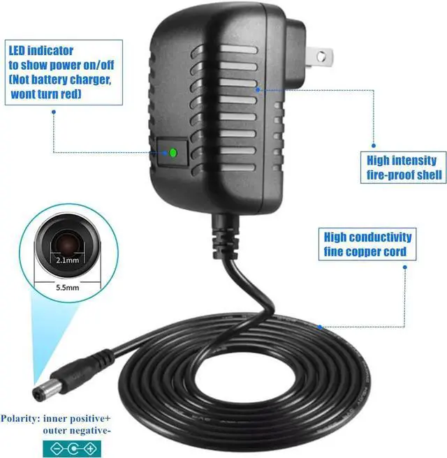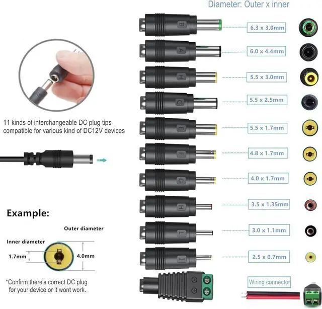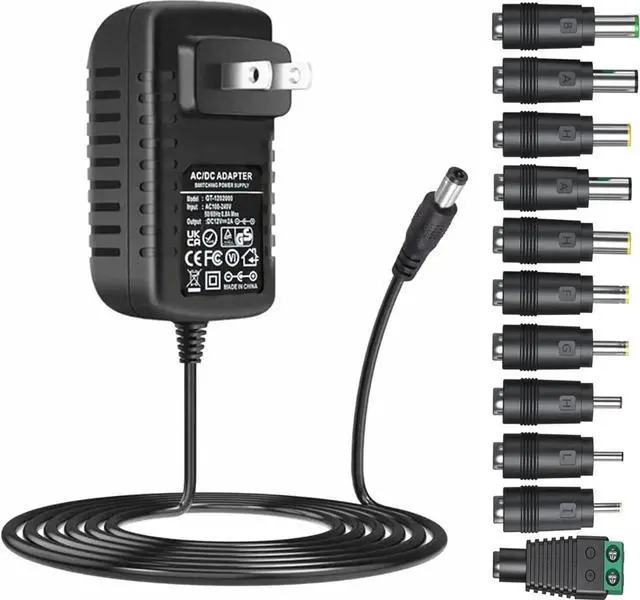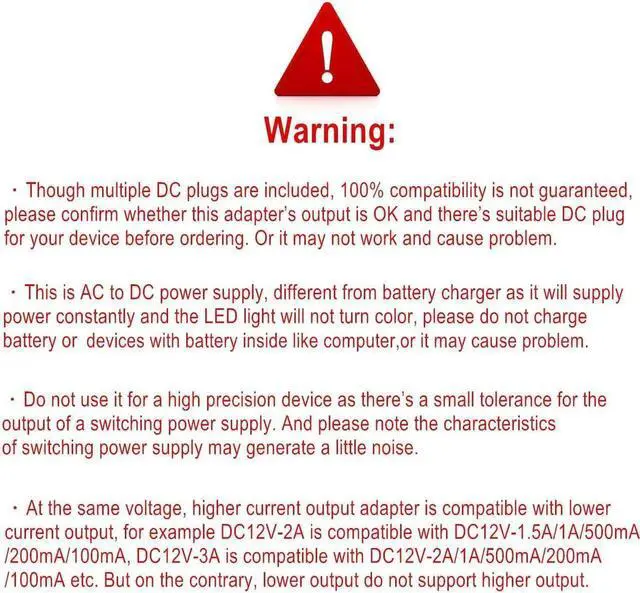 Polarity: inner positive+/outer negative- (same as most DC12V devices). [Safety&Durability] Over voltage/ over current/ short circuit/over loaded/surge protection system loaded robust design with fireproof shell and superior heat dissipation board without fan noise CE/FCC/DoE VI certified safety insurance and energy efficient. [Compatibility] Except for the common 5.5 x 2.1 mm DC plug this power supply also come with 11 interchangeable plug tips support almost all small DC12V devices such as LED Strip Lights WIFI Router ADSL Cats Bluetooth speaker GPS webcam digital piano keyboards Switches CCTV Security Cameras and other devices which are powered by DC12V (2A 1.5A 1A 800mA 500mA 400mA 200mA 100mA) power supply. [Warning] Please check the DC socket size power consumption polarity of the device to make sure the ac adapter/power supply fit before ordering or it may not work or cause problem. (To ensure good performance and durability try not to exceed 80% of the total output of the adapter for long time use)[After Sale Service] All our products will pass strict test before sending out theres seldom faulty during packing or shipment if theres any problem with the power supply we'll tackle it for you within 24 hours thank you in advance.