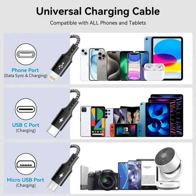 Charging Cables: This fast charging cable with 3 different USB ports including Lightning Micro-USB and USB-C ports. Support to charger most of the mobile phones available on market.