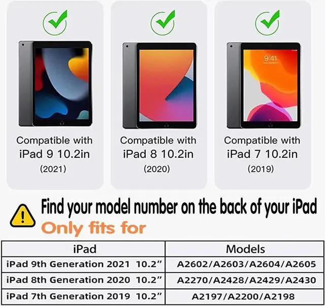 Shockproof Case ONLY for iPad 10.2Just Compatible with iPad 9th/8th/7th Generation 10.2 inch 2021/2020/2019,Model Number:(A2602/A2603/A2604/A2605/A2197/A2198/A2200/A2270/A2428/A2429).It is NOT compatible with any other versions of iPad. Please check the model number of your iPad on the back before purchase.