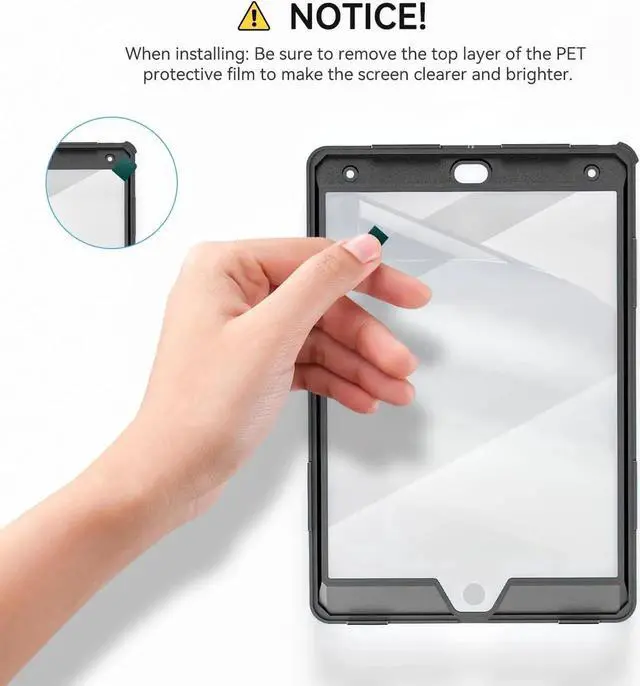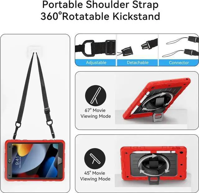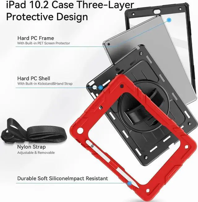 Detachable & Adjustable Shoulder StrapAttach the strap to any two corner holes of this iPad 10.2 Case.Carry your iPad conveniently wherever you are at home, at work,or on a trip.You can also hang it behind the headrest of the car seat for shared viewing.