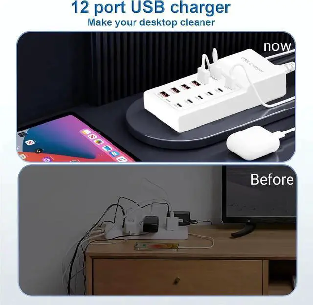 12 Ports USB ChargerThis Power up to 50W Charger With 6 USB-C Ports and 6 USB-A Ports ( 2.4A ) multiPort USB Charger AC100-240V equipped. Intelligent port technology can achieve a maximum total charging current of 10A in 12 ports or a maximum charging speed of 2.4 amperes per port. Super CompatibilityThe Multiport USB desktop hub charges multiple devices at once while the 12 Port hub is compatible with USB C and USB A port devices compatible with iPhone 16/15/14/14Plus/14 Pro/14 Pro Max/13/13 Mini/13 Pro/13 Pro Max/12/12 Mini/12 Pro/12 Pro Max/11/11 Pro/11 Pro Max/XR/XS/X/8/7 compatible with Galaxy S24/S23/S22/S21/S20/S10/S9/S8/Tablets/LG/Xiaomi/Google Pixel/MP3/MP4 Players/ E-Readers/USB Fans/Gaming Devices/Bluetooth Speaker and other digital USB devices.