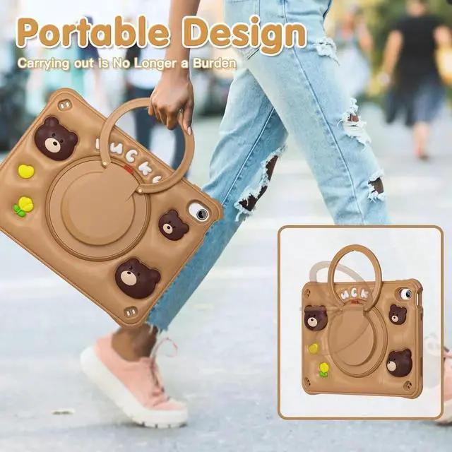 360° Rotating Silicone Hand Strap and Hidden Kickstand: The bottom-mounted, adjustable silicone hand strap provides a secure grip for little hands, while the retractable kickstand offers adjustable viewing angles for hands-free use during learning or play