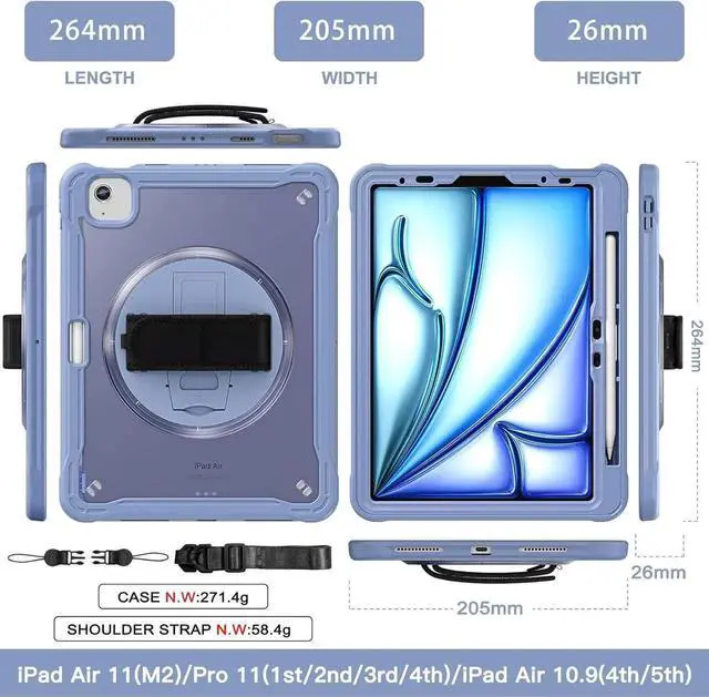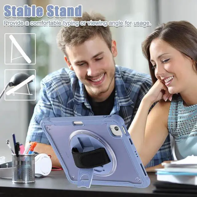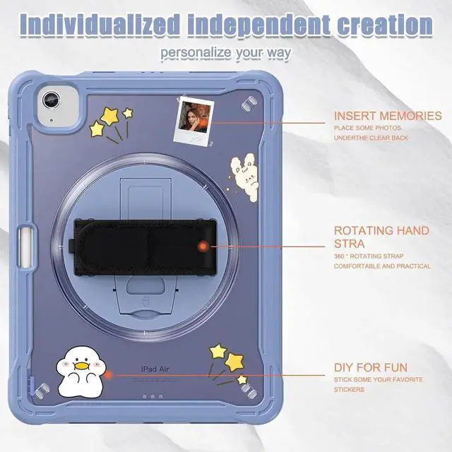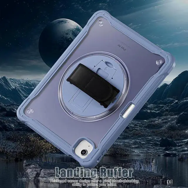 360° Rotating Hand Strap Design: With a 360° rotating hand strap design, this case offers versatile handling options, allowing you to comfortably carry your iPad Air in any orientation, making it ideal for on-the-go use.