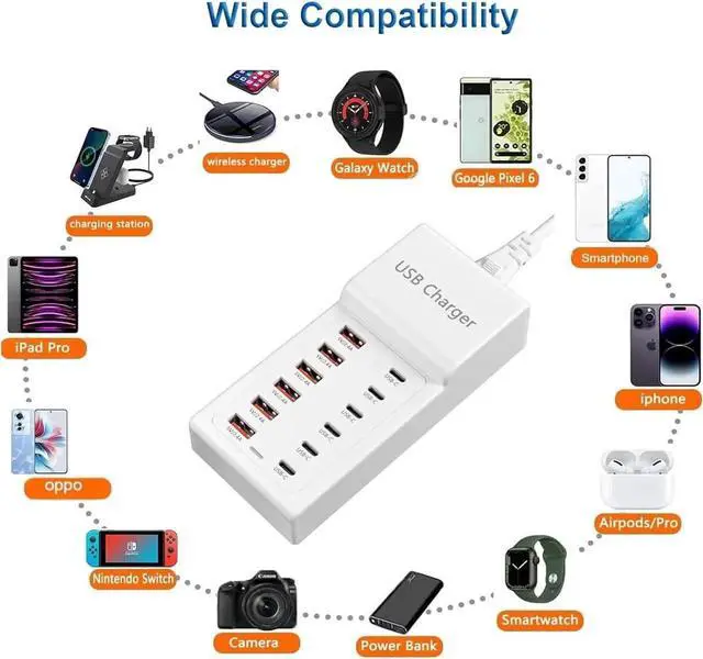 12 Ports USB ChargerThis Power up to 50W Charger With 6 USB-C Ports and 6 USB-A Ports ( 2.4A ) multiPort USB Charger AC100-240V equipped. Intelligent port technology can achieve a maximum total charging current of 10A in 12 ports or a maximum charging speed of 2.4 amperes per port. Super CompatibilityThe Multiport USB desktop hub charges multiple devices at once while the 12 Port hub is compatible with USB C and USB A port devices compatible with iPhone 16/15/14/14Plus/14 Pro/14 Pro Max/13/13 Mini/13 Pro/13 Pro Max/12/12 Mini/12 Pro/12 Pro Max/11/11 Pro/11 Pro Max/XR/XS/X/8/7 compatible with Galaxy S24/S23/S22/S21/S20/S10/S9/S8/Tablets/LG/Xiaomi/Google Pixel/MP3/MP4 Players/ E-Readers/USB Fans/Gaming Devices/Bluetooth Speaker and other digital USB devices.