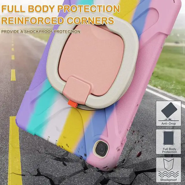 [Multi-Function Features] 360°rotating +180°folding Grip can be used as a handle, easy to hang your Tablet in kitchen, washroom, bedroom; Kickstand is stable enough to stand on different surfaces for children to view. And with a adjustable shoulder strap, it is convenient for you to carry and hang everywhere.