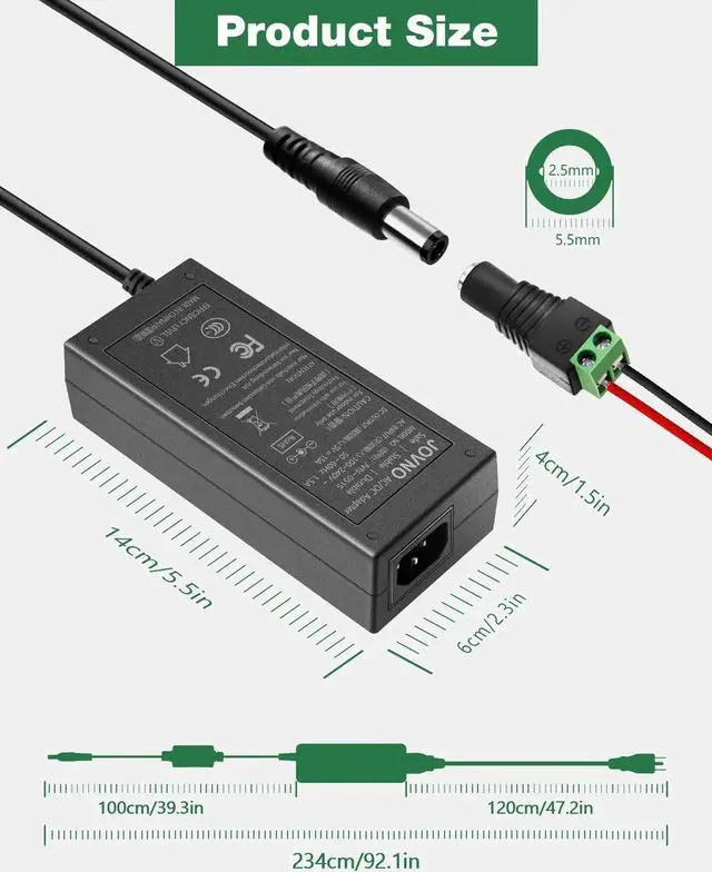 User-friendly Design We especially give away a female DC connector, so you can screw wires onto it easily to meet more application scenarios. 7.5ft long power cable makes it convenient to use.