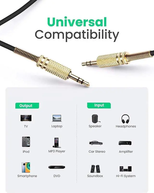 Compatible with iPhone iPod iPad HyperX / Boss/ Astro / headset Echo Hi-Fi car stereos tablets laptops smartphones MP3 Player speakers and any other audio-playing devices 3.5 mm TRS male-to-male stereo audio wire transmits audio in stereo formatWorks with any device equipped with a standard 3.5 mm audio jack or AUX-in portGold-plated plugs with metal shell for reliable and durableMeasures 2 feet ( 0.6 meters) to 8ft ( 2.5 meters) long