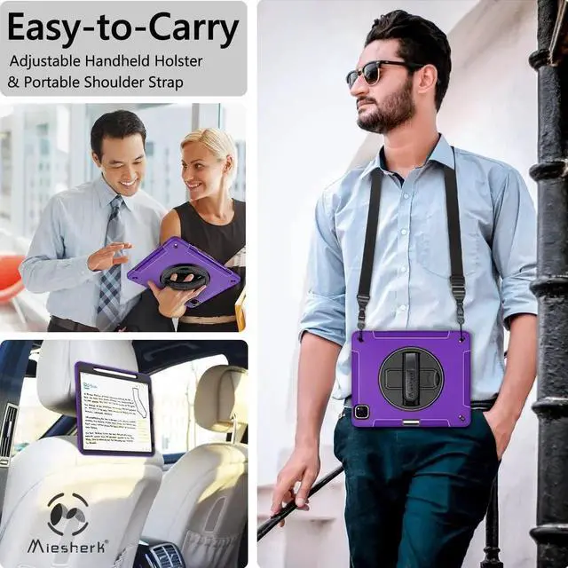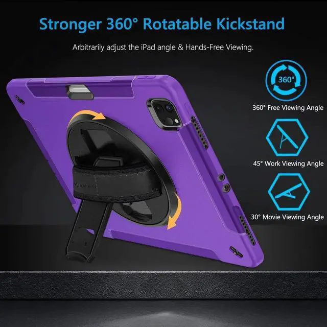 STABLE ROTATABLE KICKSTAND & ADJUSTABLE HANDHELD: iPad 12.9 case 360° rotating foldable stand provides multiple angles(30°/45°/60°), nice to view, typing, or draw. Ergonomically adjustable hand strap easier to hold, the matte coating prevents slipping out of your hand.