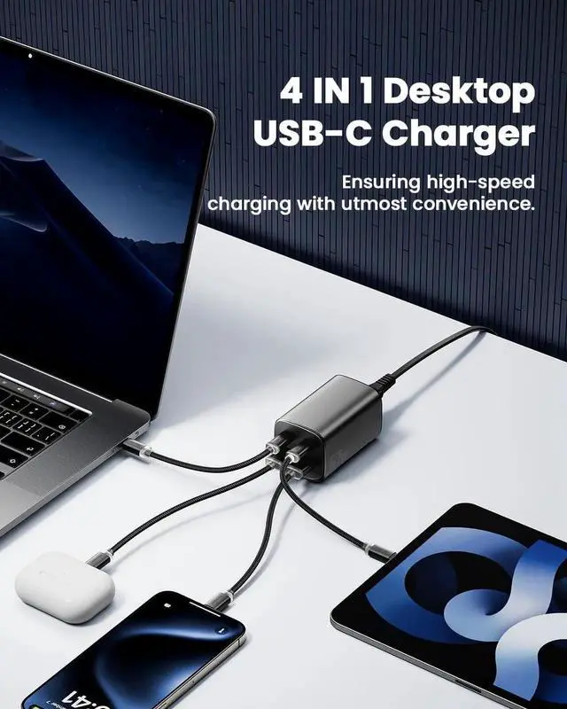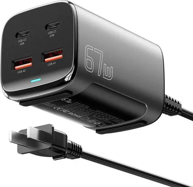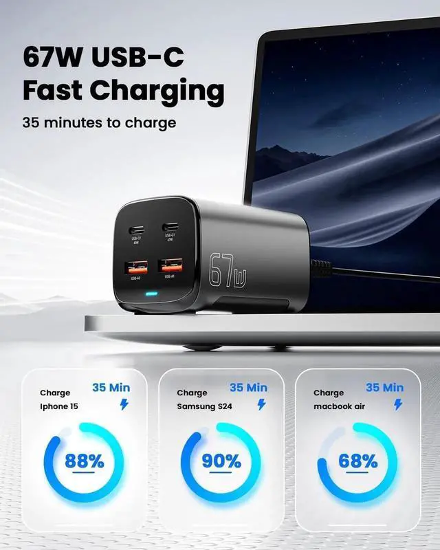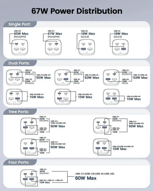 Charge 4 Devices SimultaneouslyWith two USB-C ports and two USB-A ports offering a total 67W of power. When charging single-port, C1 port support 67W max. When charging multi-port, C1 port maintains output of 45W max, which always ensures that you can charge a macbook at the same time