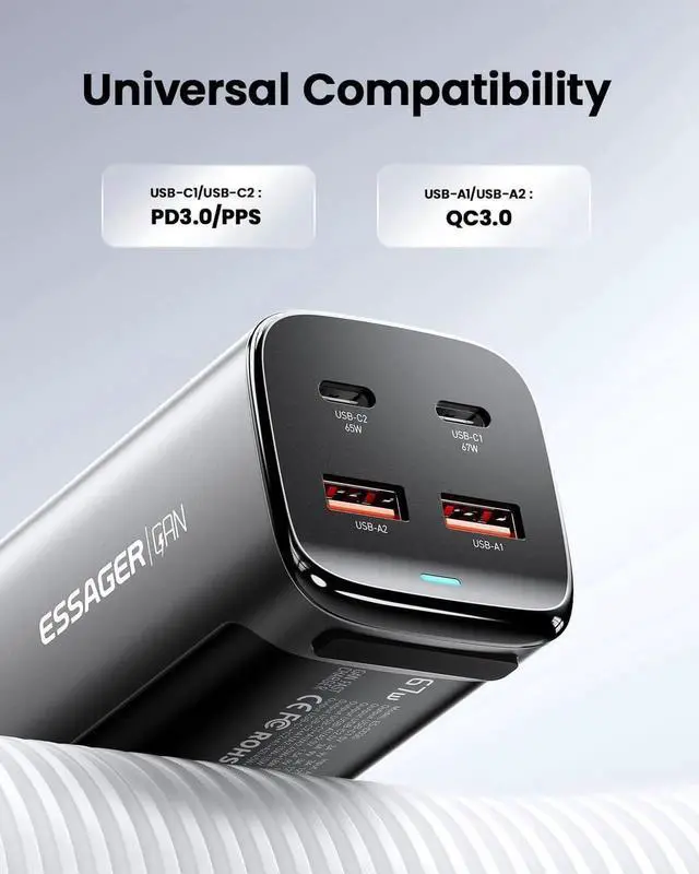 Universal Compatibility 67W GaN charger with PD/QC3.0 charging protocol, high-speed charging to virtually any mobile device. Also supports Programmable Power Supply (PPS) for compatibility with Super Fast Charging
