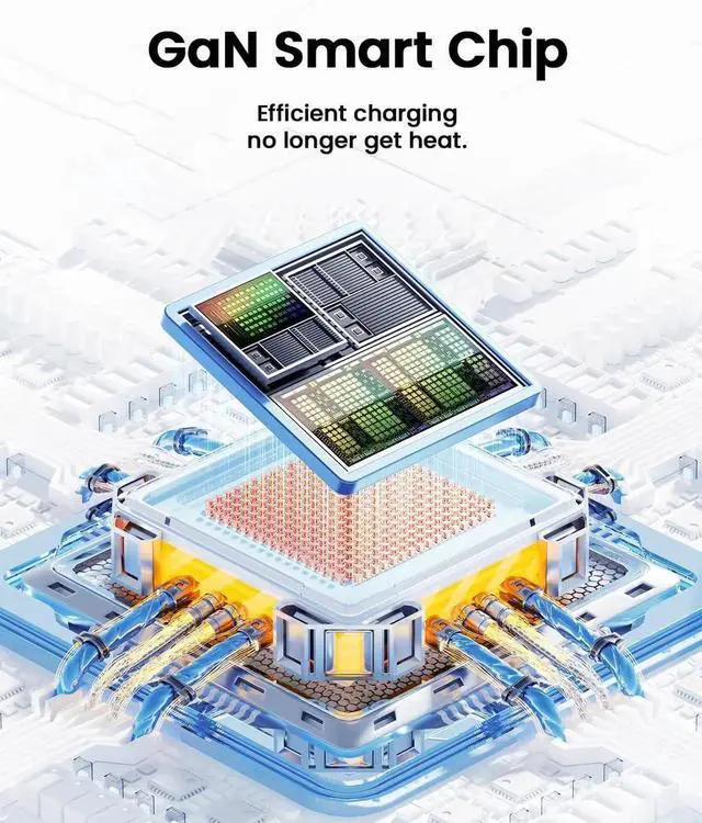 Compact & Versatile This usb c GaN charger is smart by automatically distributing the correct amount to each device with accompanying 3.3ft/1m power strip. The built-in intelligent charging GaN chip in this usb c charger switches to trickle charging mode when the battery is fast full, protecting the long service life of battery with better heat dissipation