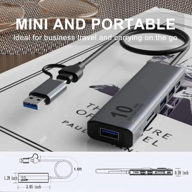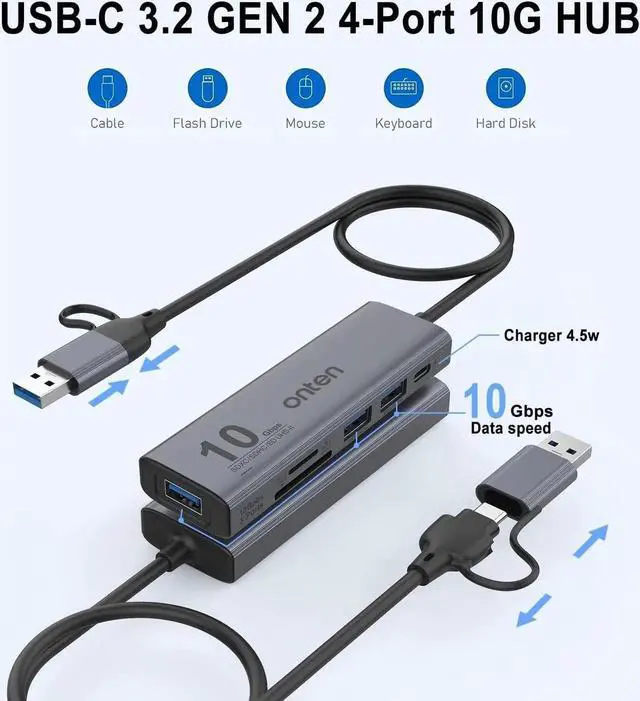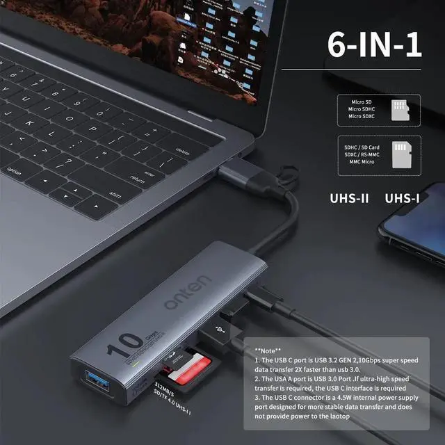 UHS-II SD4.0 and 10Gbps HUB USB 3.2 GEN 2 HUB with UHS I I Card Reader. Has both USB-A and USB-C connectors,(The USB-C connector speed is up to10Gthe USB-A connector speed isHigher than 5G but less than 10G ) it can be used on almost all computers and cell phones, and also has 3 USB 3.2 GEN 2 10G high-speed ports, and Dual-slot UHS I I SD/TF 4.0 Card Reader.NOTE: The HUB does not aceept USB C Power Adapters for Power Delivery pass through to laptop