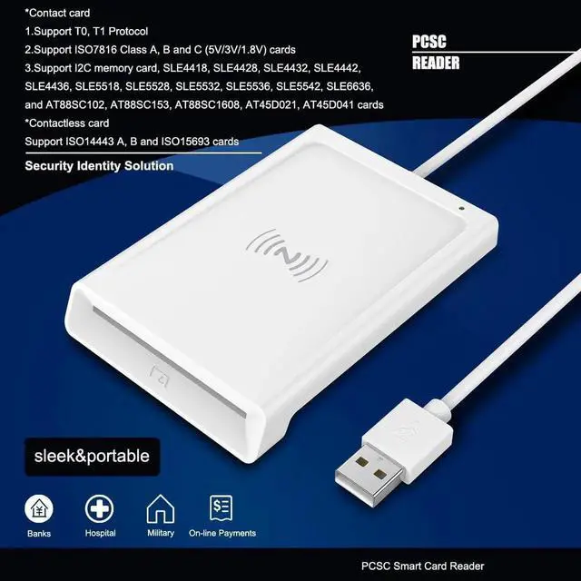 Contact card support T0, T1 Protocol. Support ISO7816 Class A, B and C (5V/3V/ 1.8V ) cards, PC/SC 2.0, Microsoft WHQL, EMV, and USB-IF CCID standards. Recommended by militarycac. com, support I2C memory card, SLE4418, SLE4428, SLE4432, SLE4442, SLE4436, SLE5518, SLE5528, SLE5532, SLE5536, SLE5542, SLE6636, and AT88SC102, AT88SC153, AT88SC1608, AT45D021, AT45D041 cards. online-banking or digital signature applications: ActivClient, AKO, OWA, DKO, JKO, NKO, BOL, GKO, Marinenet, AF Portal, Pure Edge Viewer, ApproveIt, DCO, DTS, LPS, Disa Enterprise Email etc.