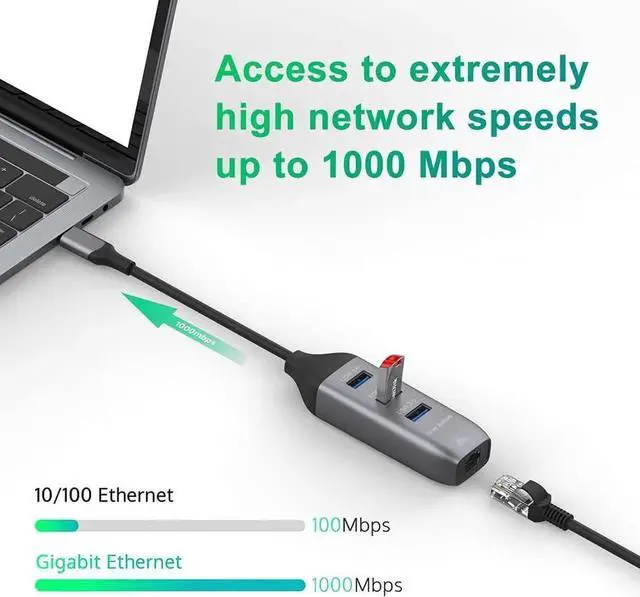 1Gbps Ethernet NetworkUSB C to Ethernet adapter.Stable transmission speed, easy to download large files, stable connection speed up to 1 Gbps, downward compatible with 100Mbps / 10Mbps / 1Mbps. PS: CAT6 and above Ethernet cable for reach 1Gbps network.