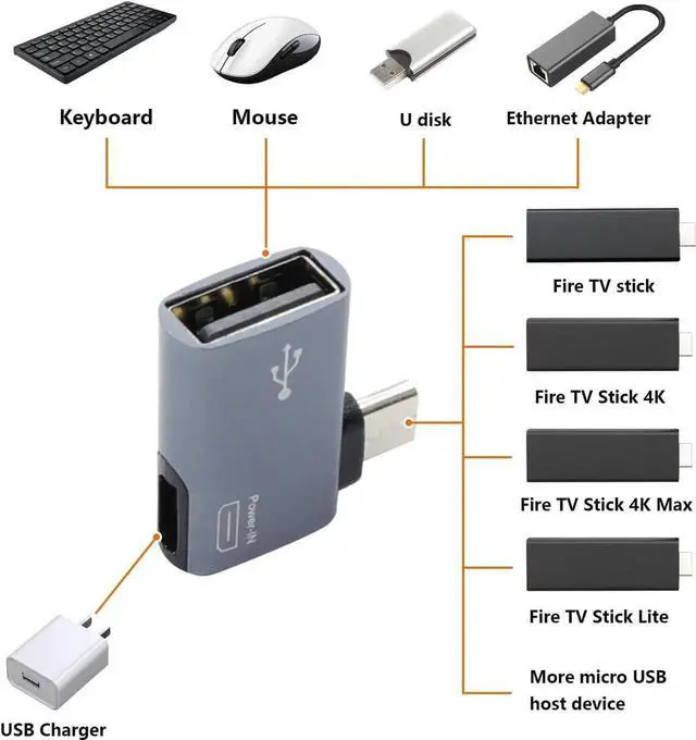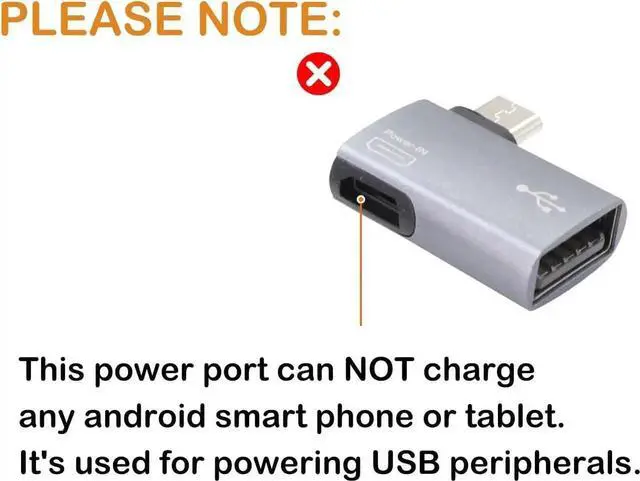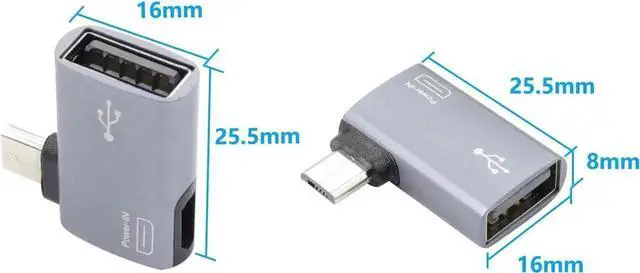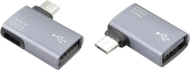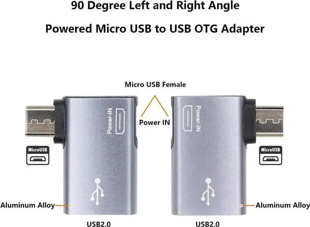 Qty: 2 pcs 90 degree left/right angle micro USB 2.0 OTG host adapter (with power port) two different angles to meet your different needsPlug and Playmicro USB OTG adapter is made of aluminum alloy shell anti-oxidation anti-scratch durable. Support hot plug and play no need to install driverNoteThe micro USB female port cannot charge cell phones or tablets. It only supports powering USB 2.0 peripherals. Make sure your device's battery does not drain quickly