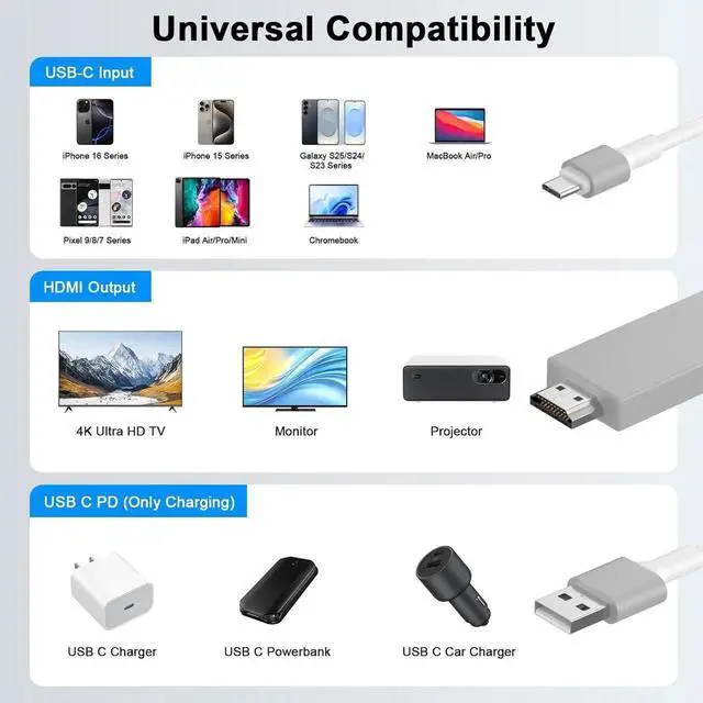 USB C to HDMI Cable for iPhone 17 to TV The wamaxlink USB C to HDMI cable adapter supports watch sports events movies video games and photos/albums directly on the monitor/display/TV equipped with HDMI. The resolutions of this iPhone 17 Pro Max to HDMI cable is up to 1080p Just share happiness with your family or firends. Universal Compatibility The USB C to HDMI cable adapter is compatible with devices equipped with USB-C ports supporting DisplayPort Alternate Mode. Compatible with iPhone 17/17 Pro/17 Pro Max/Air/16/16 Plus/16 Pro/16 Pro Max/15/15 Plus/15 Pro/15 Pro Max MacBook Pro/Air iPad Pro/Air/Mini Galaxy S25/S25+/S25 Ultra/S24/S24+/S24 Ultra/S23/S22/S21/S20 Series and more USB C devices.