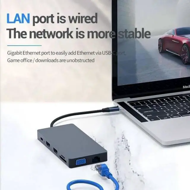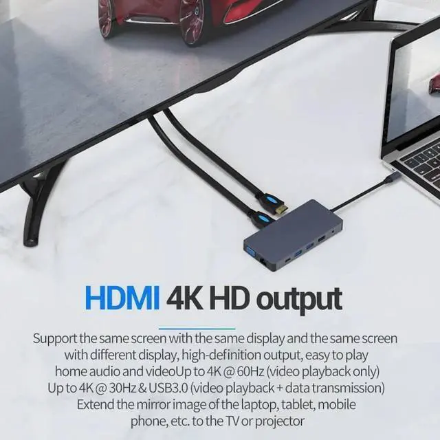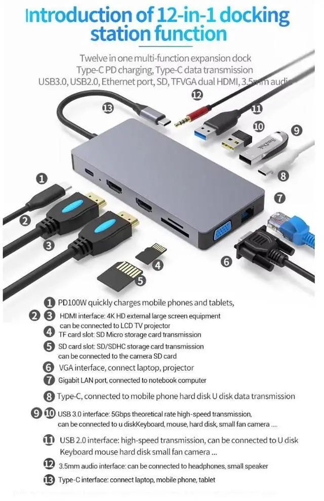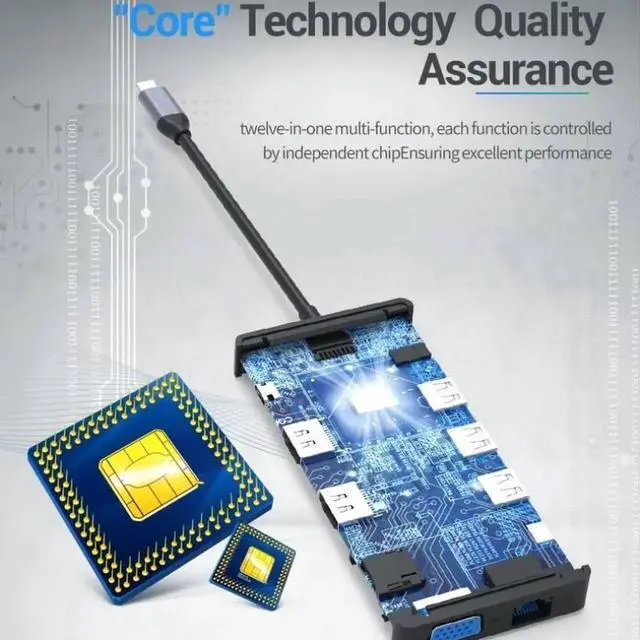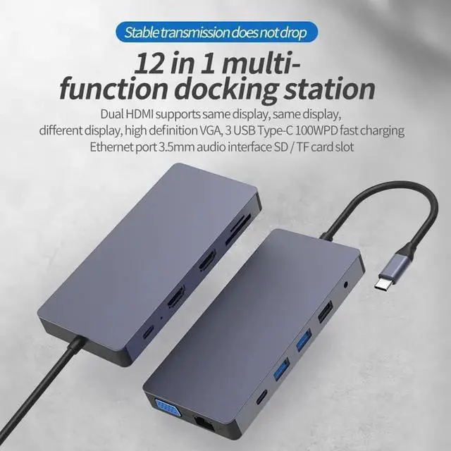 Feature highlights:This 12-in-1 USB-C hub docking station supports dual 4K HDTV and VGA outputs, offering versatile connectivity with USB-C, USB-A, SD/TF card slots, audio, LAN, and PD 100W charging. It features aluminum alloy construction for durability and comes with CE, FCC, and RoHS certifications ensuring compliance with international safety and environmental standards, providing market access assurance.