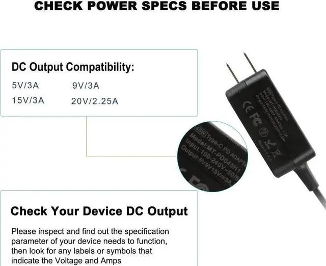 Smart & Fast ChargingOutput:5V-3A or 9V-3A or 15V-3A or 20V-2.25A 45W Input:100-240V 50-60Hz.