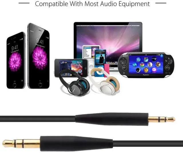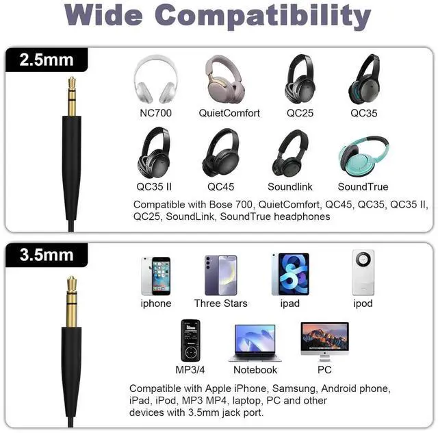 3.5 mm to 2.5 mm Audio Cable 3.5 mm to 2.5 mm audio cord perfect compatible with QuietComfort QC45 QC35II QC35 QC25 NC700 OE2 OE2i On-Ear2 Soundlink Soundtrue Headphones. Also compatible with J BL Tune 710BT 660NC 750NC 760NC E40BT E45BT E55BT E65BTNC Duet BT Duet NC Live 400BT Live 460 Live 500BT Live 650BTNC AKG Y55BT Y55 Y50 Y45 Y40 and more other selected headphones with 2.5 mm jack portUniversal CompatibilityThe 3.5 mm connector fits standard 3.5 mm AUX ports widely compatible with iPhone parts Android phones iPad iPod MP3 MP4 laptop PC and other devices with 3.5 mm jack portStereo Sound QualityReplacement headphone cord is made of Oxygen-free copper and 24K gold-plate straight connector resist corrosion and ensure optimum stereo sound qualityUltra DurableThis audio cable made of premium TPE material pure OFC copper wire passed 10 000 bending tests high elasticity high strength high resilience ensuring high fidelity sound quality and providing maximum's durability.