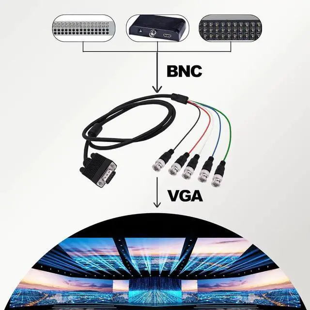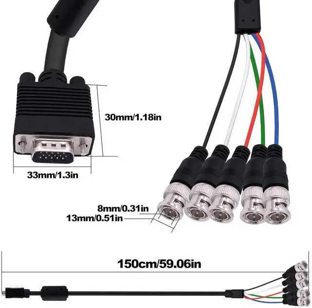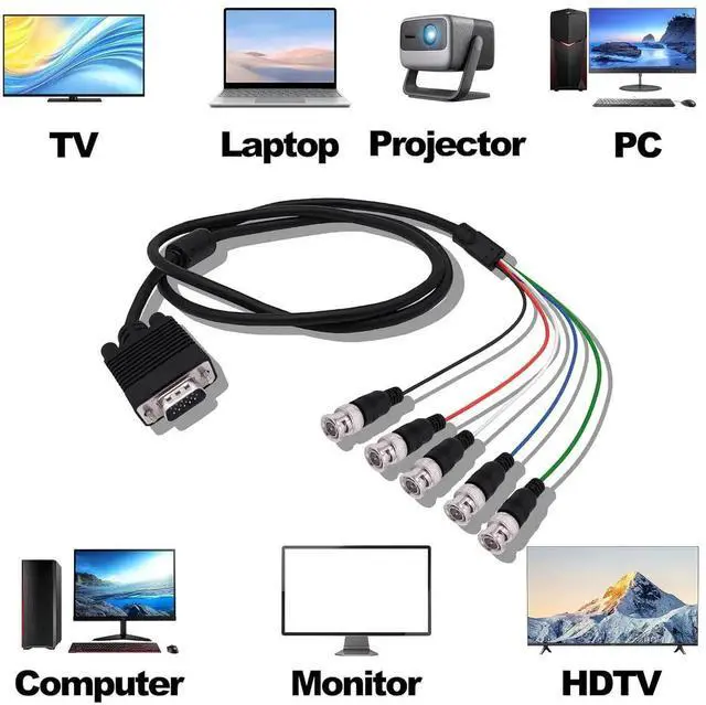 BNC Cable: This HD15 VGA to 5 BNC adapter cable also called RGBHV component cable consists of five independent input units: R G B H and V. These 5 internal coaxial cables support the highest resolution of most displaysUses: VGA to 5 BNC cable for high-end monitors with 5 BNC inputs namely RGBHV signals to improve display clarity. BNC cables can be used to connect PCs cable boxes sound mixers and other equipment as part of a professional video setup. Only applicable to RGBHV interface on display devicesBNC