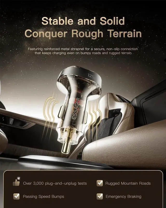 125W Fast Charging 125W fast USB C car charger supporting PD/PPS 65W(Max) and QC30W(Max) and Huawei 22.5W(Max) high output, and can fast charging 3 devices simultaneously. Can charge iPhone 15/14/13/12 series up to 88% and Galaxy S24/S23/S22 up to 90% and macbook air to 68% in 35mins. The USB C support charge for laptops, Support PD3.0/PPS charging protocol
