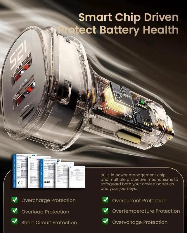 Safety Systems Our 125W car charger is equipped with intelligent control chipset, Full range provid temperature Protection, Over-Current, Over-voltage, Overcharge, Overload, Overheat and Short circuit. ensuring 100% for you and your device's protection