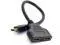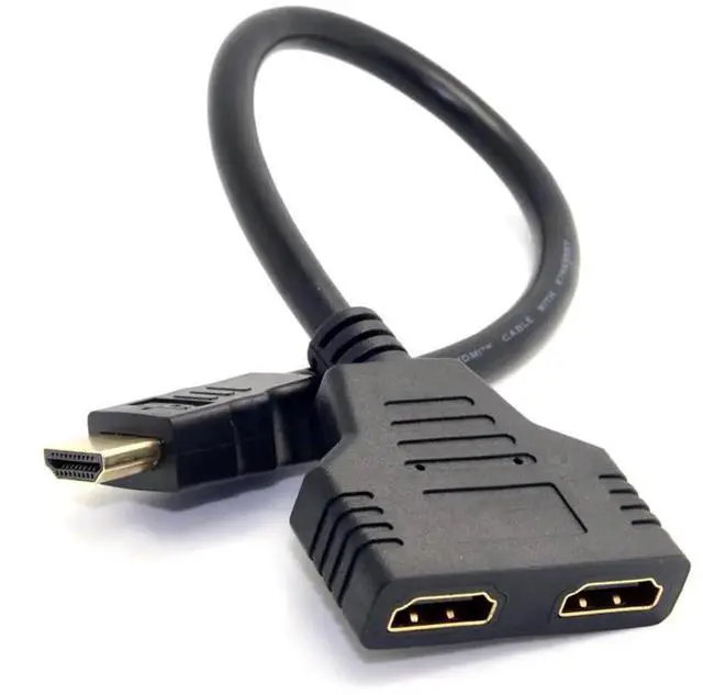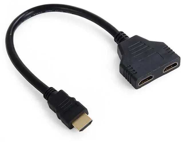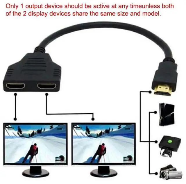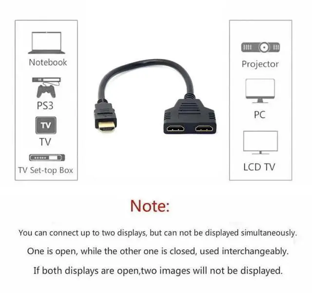 HDMI Male to 2x HDMI Female Splitter cable is for splitting HDMI high quality digital video signal to 2 HDMI Female output simultaneously. You can only connect one input device ( i. e. DVD player cable box or satellite receiver ) to two output device( i. e. TV or projecto r). and only one output device can be displayed at the same time. You can't connect two input device ( i. e. PC DVD player cable box or satellite receiver) to one output device(i. e. Monitor TV or projector )
