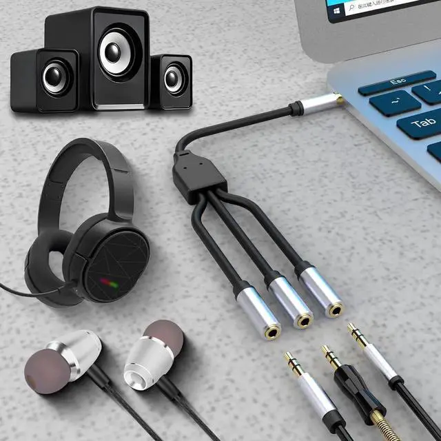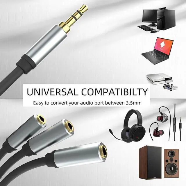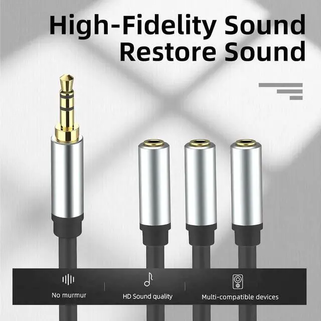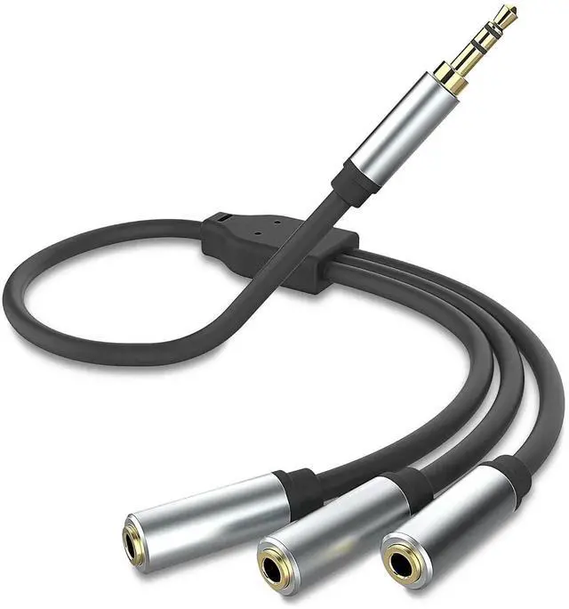 1/8 3.5 mm Stereo Plug Male to 3 1/8 3.5 mm Stereo Jack Female 1 Input 3 Output Stereo Audio Splitter Cable. Please note this cable can't be used as 3 input to 1 output. 3.5 mm Mini-Jack (3 Position-TRS) Male Plug. 3.5 mm Mini-Jack (3 Position-TRS) Female Jack. The cable can connect triple stereo headphones into a single mini-stereo jack on your MP3 player PC CD MD or any device. Made of 24K corrosion-resistant gold-plated connectors for a strong and durable connection stable transmission ensuring minimal signal loss and delivering the best sound quality with clarity and smoothness.