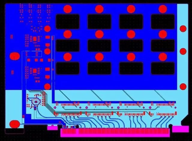 Gold finger immersion gold process, increase the gold thickness to 5U. 4xlotes M. 2 slots, large area hollow for heat dissipation. CLK clock split IC, 1 point 4 channels.