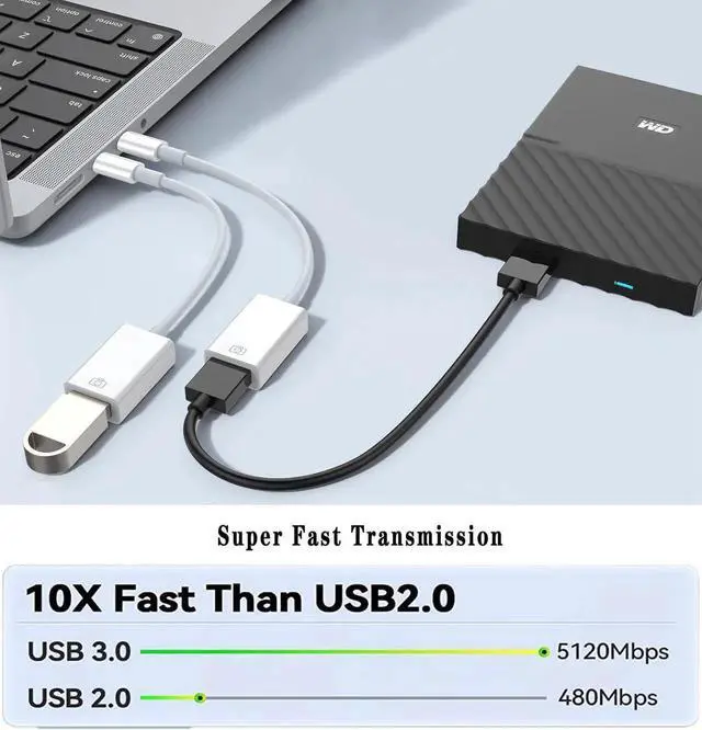 Upgraded Version: This iPhone USB-C to USB Camera Adapter support USB 3.0 transmission speed up to 5Gbps And it also support USB 2.0 The transfer speed is 25MB/S-30MB/S which is 2 times faster than others help you save time.