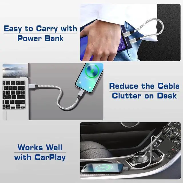 Portable Length & Durable Quality: 1 foot (12 inch) usb c to lightning short cable is tangle-proof and easy to carry. Perfect for use with charging stations or portable charger power banks. Braided with nylon material has been tested of bending over 20 000+ times. The durability is 5 times that of ordinary cables. Fast charging & Data SyncOur short USB C to lightning cable supports up to 30W safe and fast charging. High speed data transfer up to 480 mbp/s for transfer photos music videos files. It efficiently charges your iOS devices. Charging Speeds Faster than USB A Cable.