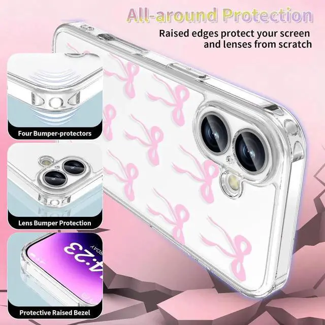 CompatibilityCompatible with iPhone 17 6.3. The package include 1 pack clear phone case + 1 pack tempered glass screen protector + 1 pack cleaning kitCute Bow PatternsLaser-printed bow patterns with embossed texture resist peeling and discoloration maintaining vibrant colorsturn your phone into a cute fashion accessoryAlways Crystal ClearUltra-thin TPU material showcases your phone's original beauty. Yellowing-resistant design stays transparent for yearsFull Camera Lens ProtectionSealed lens design (vs 90% hollow-cutout cases) with 1.5 mm raised edge blocks sand/key scratches. Dual-layer shockproof edges against 6ft drops absorbing shocks and guarding against drops scratches and lens/corner impacts. Solves protruding camera wear issues permanentlyPrecision Engineering & DurabilityPremium TPU backplate + aerospace-grade PC frame.